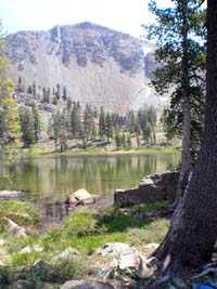 and highest of the lakes, a shallow tarn in a stand of conifers